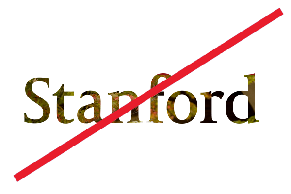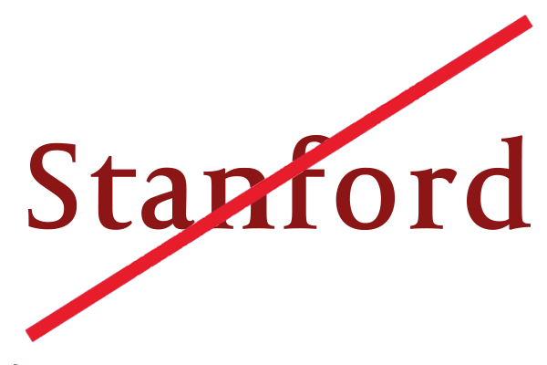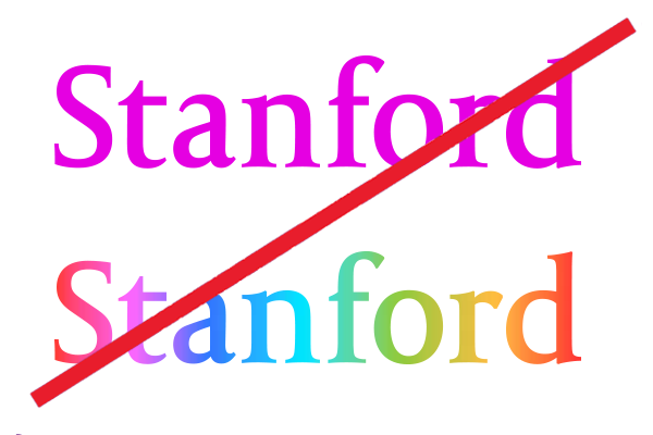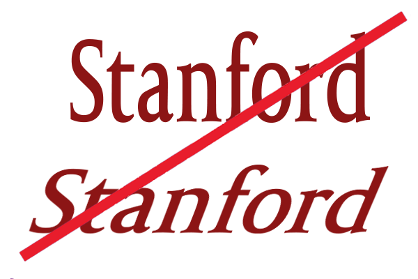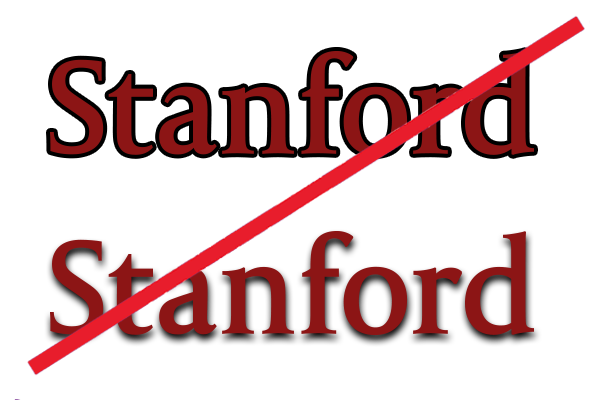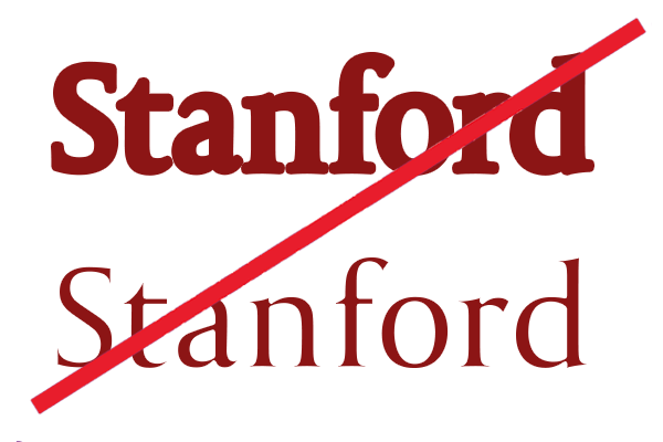 The wordmark and signatures should not be altered in any way, such as extending, condensing, outlining, adding borders, special effects or drop shadows, or attaching other words or graphics. The graphics on these pages are a few examples of incorrect usage and alterations of the Stanford wordmark. Please avoid these and all other changes to the Stanford wordmark and signatures.