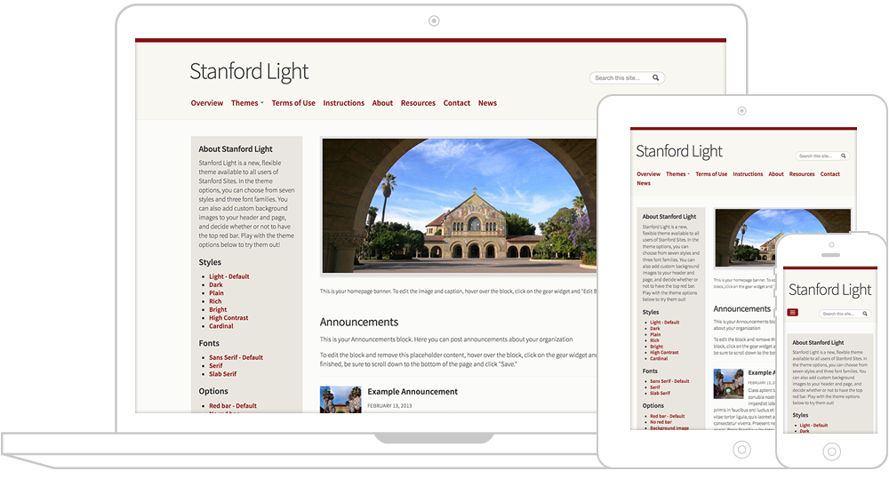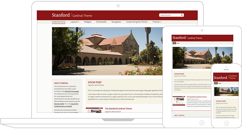 The Cardinal theme is a Stanford-branded WordPress and HTML theme that offers a traditional Stanford look and feel. The Cardinal theme is only approved for use by departments and administrative units that qualify for a department signature through the Identity Toolkit.