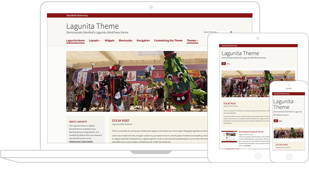 The Lagunita theme is a lightly branded WordPress theme available to any Stanford group or organization. It is installed by default when you request a new WordPress site via University IT's WordPress Installer. To update an existing WordPress site to Lagunita, download the theme.