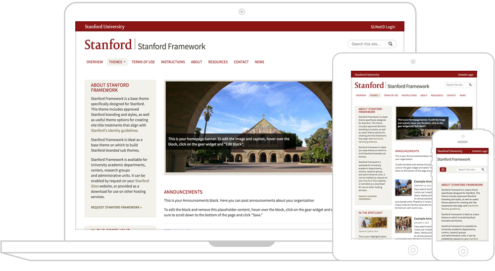 Stanford Framework is a Drupal theme specifically designed for Stanford. This theme includes Stanford branding as well as useful theme options to assist in creating site title treatments that align with Stanford's identity guidelines.